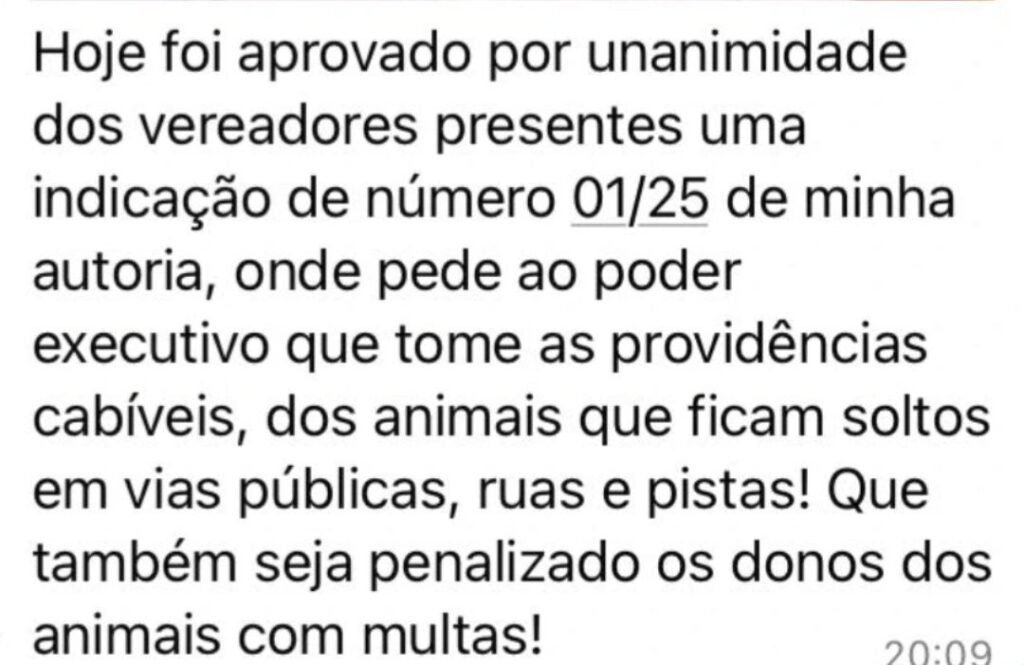 A indicação pede que sejam tomadas providências para coibir essa prática, que representa riscos tanto para o trânsito quanto para a população e os próprios animais. A proposta também prevê que os proprietários dos animais sejam penalizados com multas, caso deixem os bichos soltos sem o devido controle.