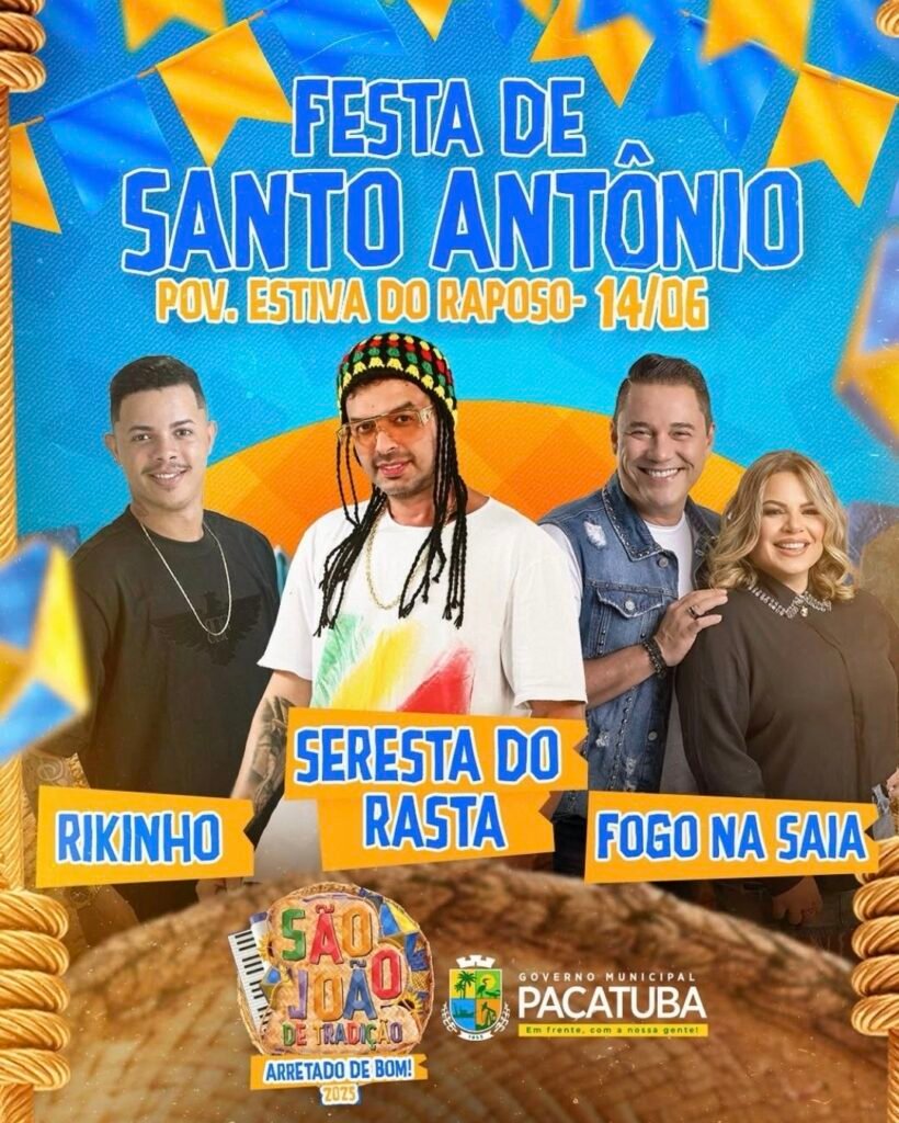 A programação promete agradar a todos os públicos, com shows de Rikinhu, Seresta do Rasta e da banda Fogo na Saia, que trarão muito forró, animação e ritmos nordestinos para não deixar ninguém parado. O evento é promovido pela Prefeitura de Pacatuba, que reforça o compromisso de manter viva a cultura local e oferecer momentos de lazer e entretenimento para a população.