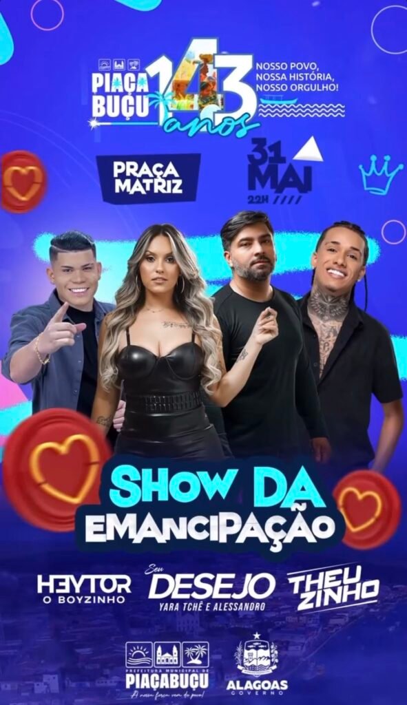 O município de Piaçabuçu, em Alagoas, se prepara para uma grande festa em comemoração aos seus 143 anos de emancipação política, marcada para o dia 31 de maio, a partir das 22h, na Praça Matriz. Com o lema “Nosso povo, nossa história, nosso orgulho”, a programação promete emocionar e reunir toda a população em uma noite de muita música e celebração.