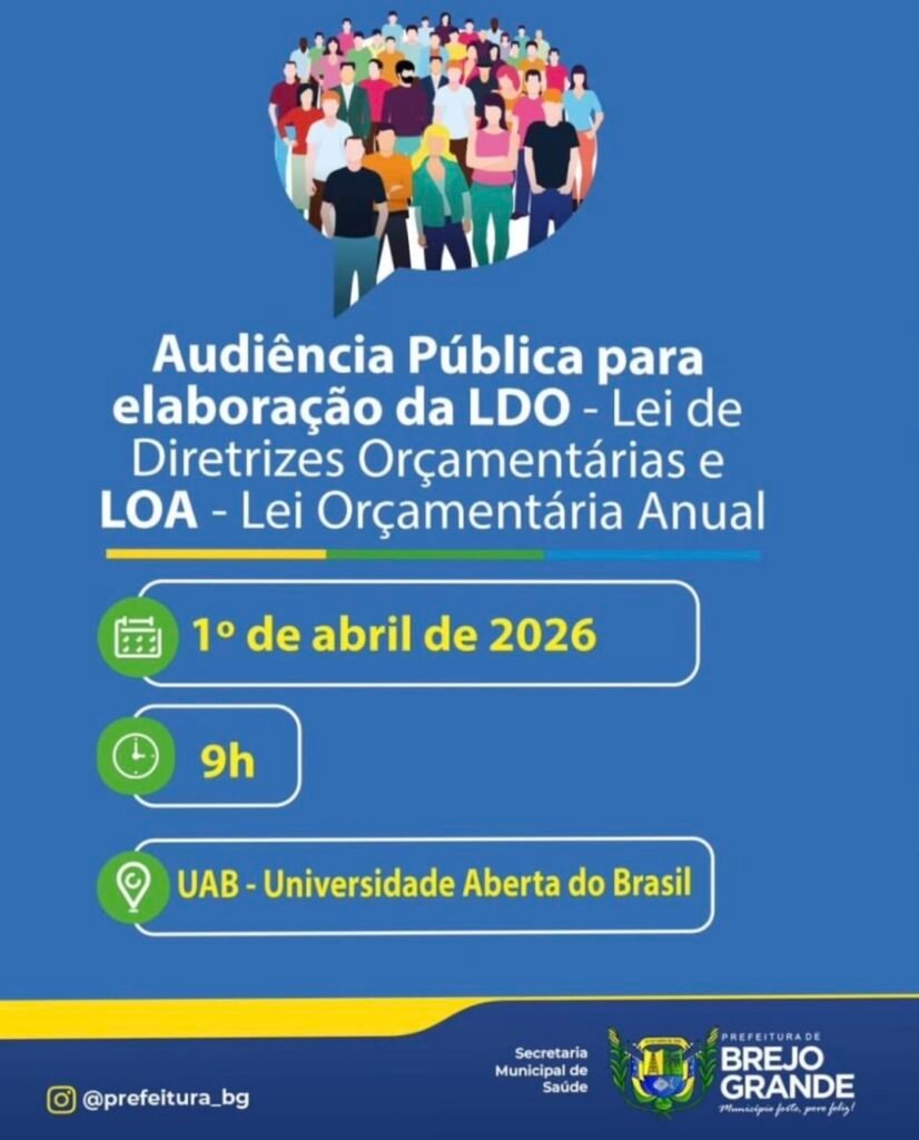 A Prefeitura de Brejo Grande – SE realiza nesta terça-feira, 1º de abril de 2026, uma audiência pública voltada à construção das diretrizes orçamentárias do município.